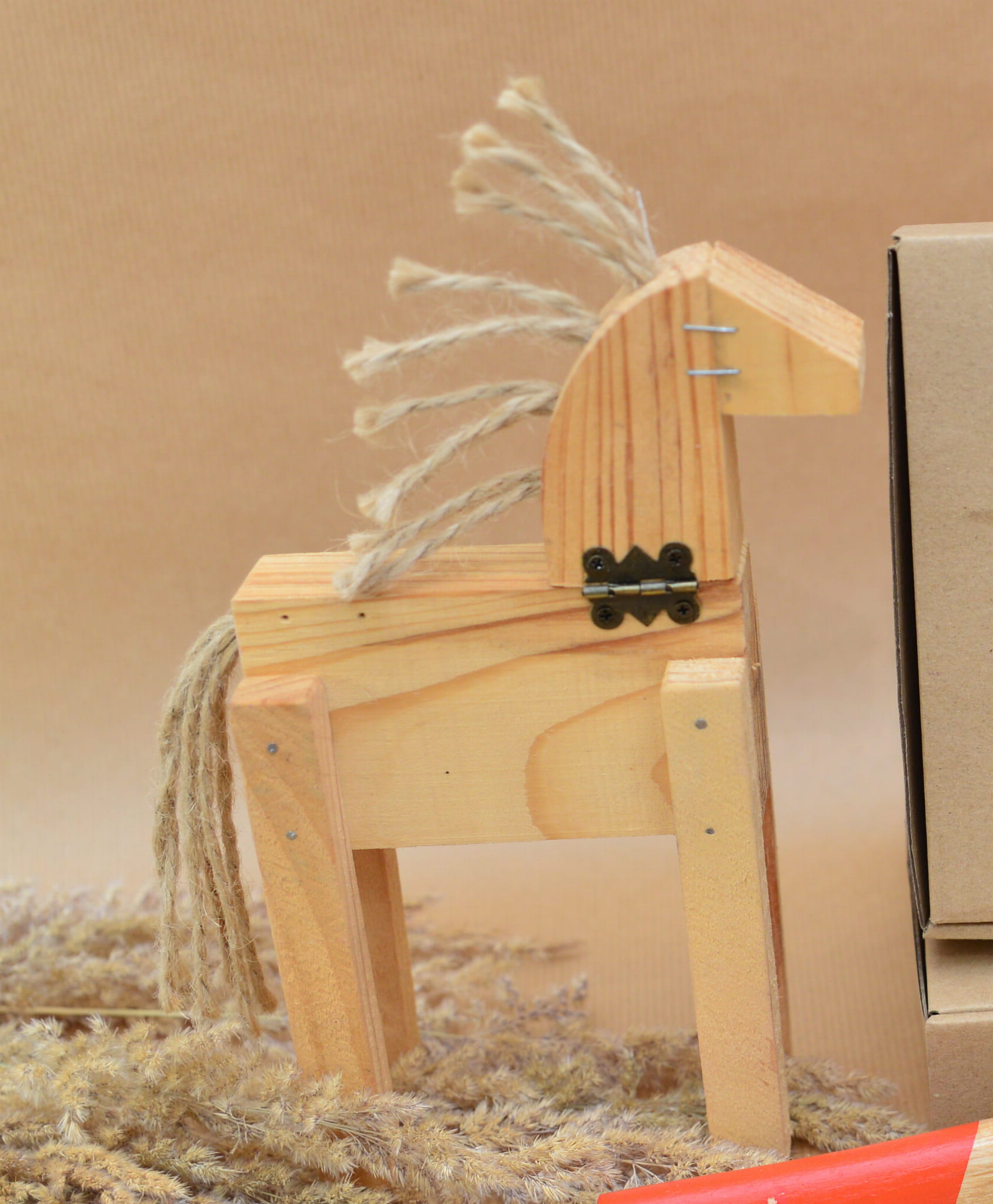Zestaw jest przeznaczony zarówno dla młodszych dzieci (przy wsparciu dorosłego), jak i dla dzieci powyżej 7. roku życia, które mogą złożyć go samodzielnie. W pudełku znajdziesz wszystko, czego potrzeba do złożenia drewnianego konika: instrukcja- krok po kroku, młotek, śrubokręt, gwoździe, papier ścierny, ołówek, nici, ozdobne zawiasy, klej, sznurki i elementy z drewna sosnowego.